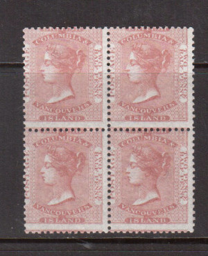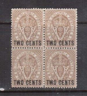 British Columbia #5 Mint rare block, full original gum, lightly hinged and very light gum disturbance as always, a showpiece, illustrated in the Welburn handbook on page 80, with certificate.