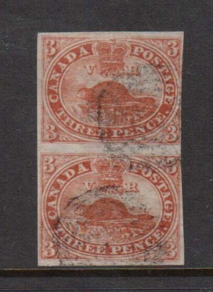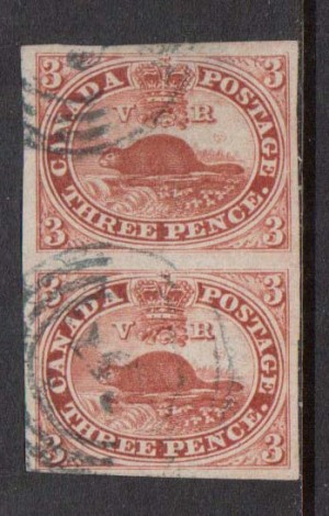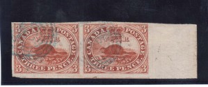 Canada #4iii Very fine used horizontal pair, from the right sheet margin on hard wove ribbed paper with light 7 ring target cancels in blue, with certificate.