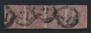 Canada #8a Extra Fine Used Strip Of Four On Ribbed Paper, A True Rarity & Exhibition Piece, Fourth Stamp Has Tiny Tear At top Margin, Large Multiple, With Certificate. Catalog: $14000.00+