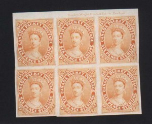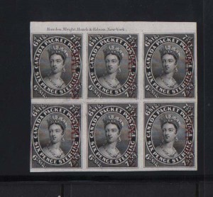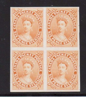 Canada #9TCiii Extra fine proof imprint block of six in orange yellow, india paper, bottom left stamp has trivial india thin, scarce, with certificate. ECV.: $4000.00+
