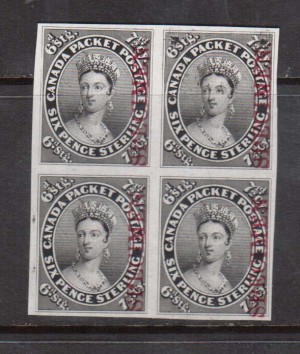 Canada #9TCi Extra fine proof block on india paper, upper right stamp shows the striking flaw in 1d of fraction in upper right triangle - misplace entry plate variety, with certificate.