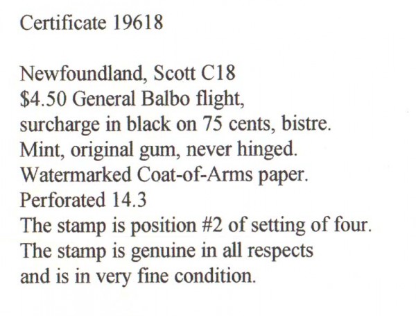 Newfoundland #C18 Extra fine, never hinged, with certificate. Catalog: $900.00